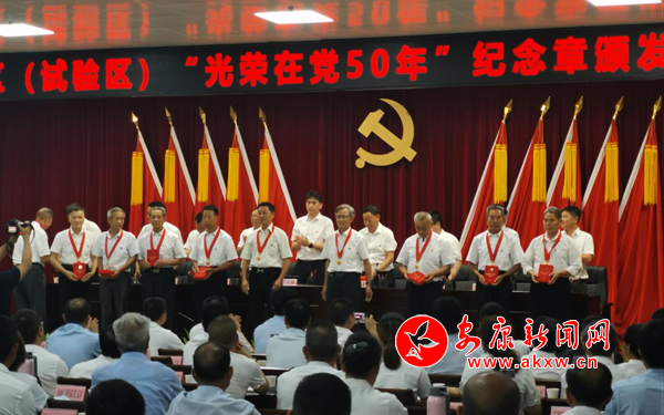 在慶“七一”表彰大會上,全體參會黨員面對鮮紅的黨旗,高舉右手,重溫入黨誓詞,鏗鏘嘹亮的宣誓聲響徹會場,激蕩人心,昭示著全區(qū)黨員矢志不渝為黨和人民事業(yè)不懈奮斗的堅定信念。會上,為高劍村黨支部等10個先進基層黨組織、王開昌等10名優(yōu)秀黨務工作者、王天蒼等20名優(yōu)秀共產(chǎn)黨員代表分別頒發(fā)了榮譽證書,為“光榮在黨五十年”的10名老黨員代表頒發(fā)了紀念章。