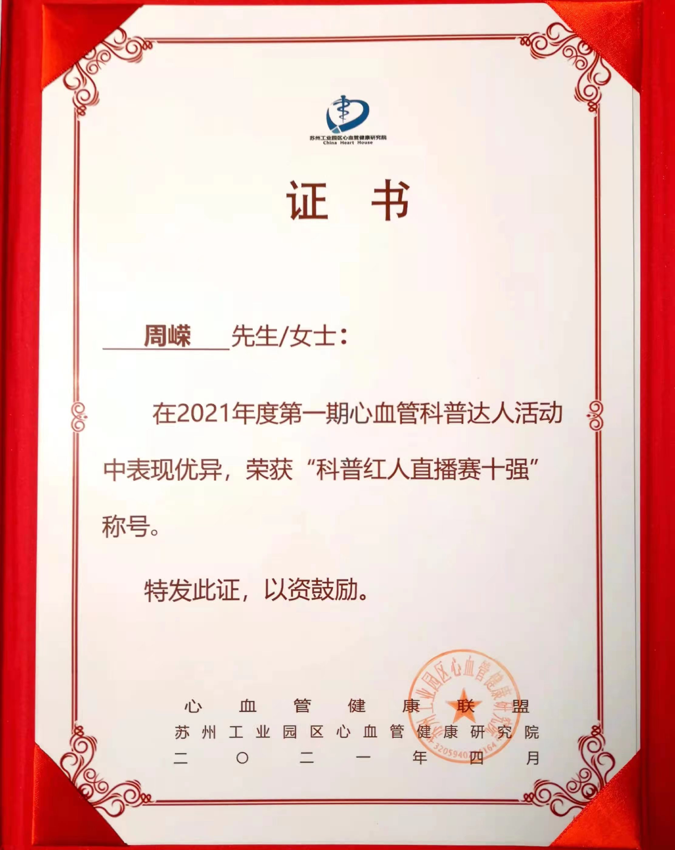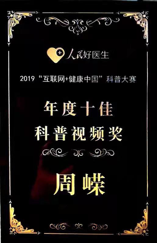 2021年 獲醫(yī)生云獎(jiǎng);獲“科普紅人直播賽十強(qiáng)”稱號