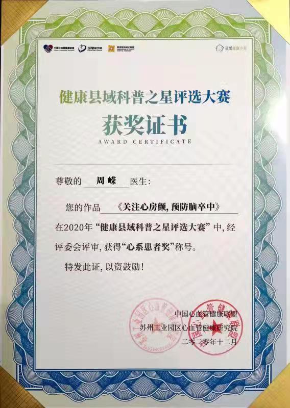 2020年 獲第二屆“互聯(lián)網(wǎng)+健康中國”科普大賽“科普達(dá)人獎(jiǎng)”