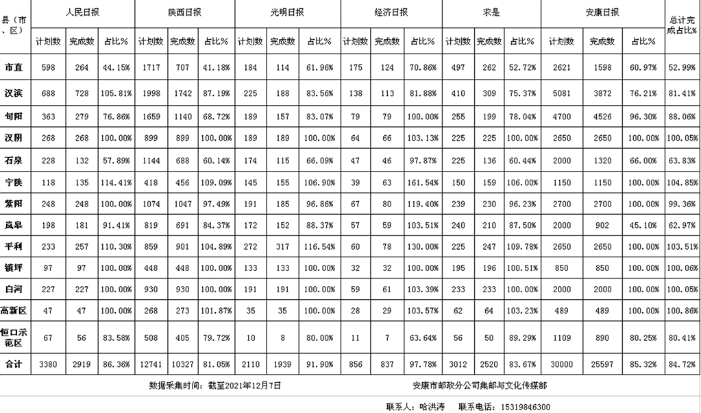 截至2021年12月7日,全市重點(diǎn)黨報(bào)黨刊完成量占下達(dá)計(jì)劃數(shù)的84.72%。征訂情況為:寧陜縣104.85%,平利縣103.51%,高新區(qū)100.86%,鎮(zhèn)坪縣100.06%,漢陰縣100.05%,白河縣100.05%,紫陽(yáng)縣99.36%,旬陽(yáng)市88.06%,漢濱區(qū)81.41%,恒口示范區(qū)80.41%,嵐皋縣62.97%,市直各單位52.99%。其中,寧陜縣、平利縣、高新區(qū)、鎮(zhèn)坪縣、漢陰縣、白河縣,措施有力,率先完成2022年度征訂任務(wù)。