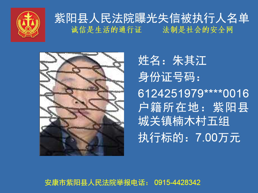 曝光失信 | 紫陽縣人民法院:關于敦促朱其江履行法定義務的公告