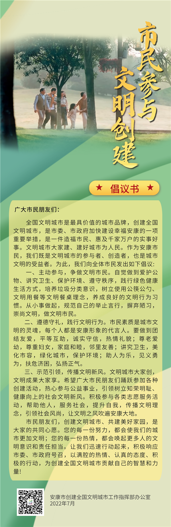 三、示范引領,傳播文明新風。文明城市大家創(chuàng),文明成果大家享。希望廣大市民朋友們踴躍參加各種創(chuàng)建活動,熱心參與公益事業(yè),引領樹立知榮明恥、健康向上的社會文明新風。積極參與各類志愿服務活動,幫助他人,服務社會,提升自我,傳播文明理念,引領社會風尚,讓文明之風吹遍安康大地。?