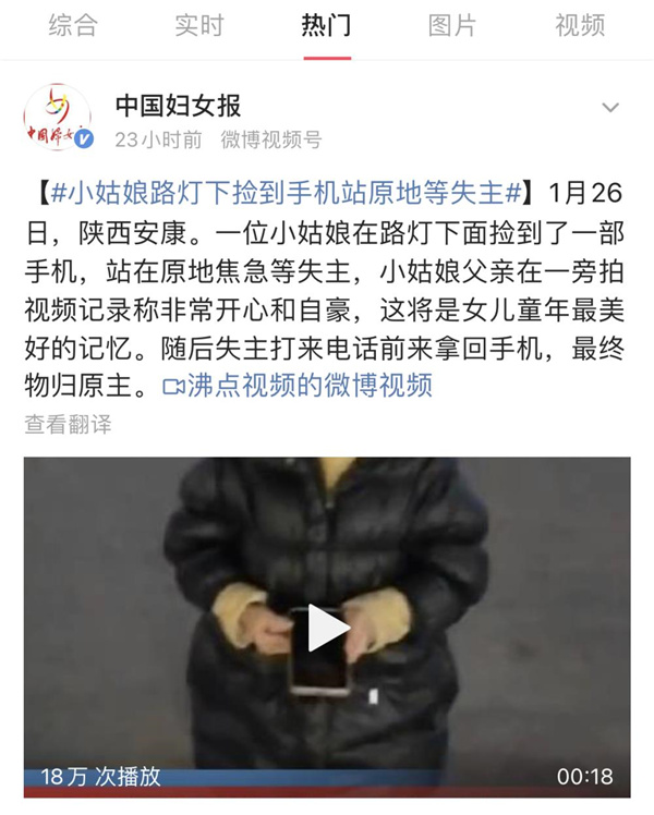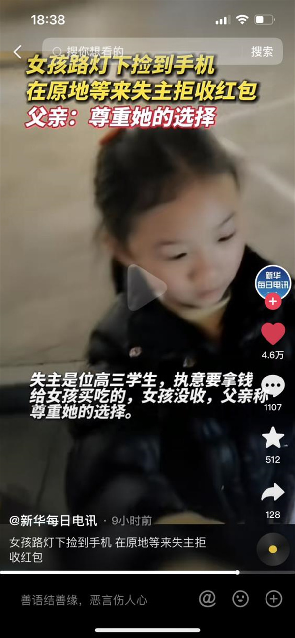 1月28日下午,#女孩撿手機(jī)站原地等失主##小姑娘路燈下?lián)斓绞謾C(jī)站原地等失主#話題沖上了抖音熱門、微博熱門,廣大網(wǎng)友紛紛點(diǎn)贊。