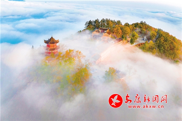 天柱山最美不過秋色,也是我在四季當(dāng)中頻繁上山的季節(jié)。每逢秋天,這里紅黃綠相間,漫山掛彩,在藍(lán)天的映襯下,多了幾分浪漫。從國道211起點的兩條上山公路,由數(shù)個“之”字連接起來,從湖邊一直盤旋至山頂?shù)陌自乒潘拢h(yuǎn)眺仿佛一個大大的“人”字形飄帶。雨后放晴的頭兩個早晨,在云霧的籠罩下,天柱山的下半身連同湖面一并被巨大的“蠶絲被”覆蓋,山的上半身或山頭浮在云海之上,像是茫茫大海上的一座孤島。