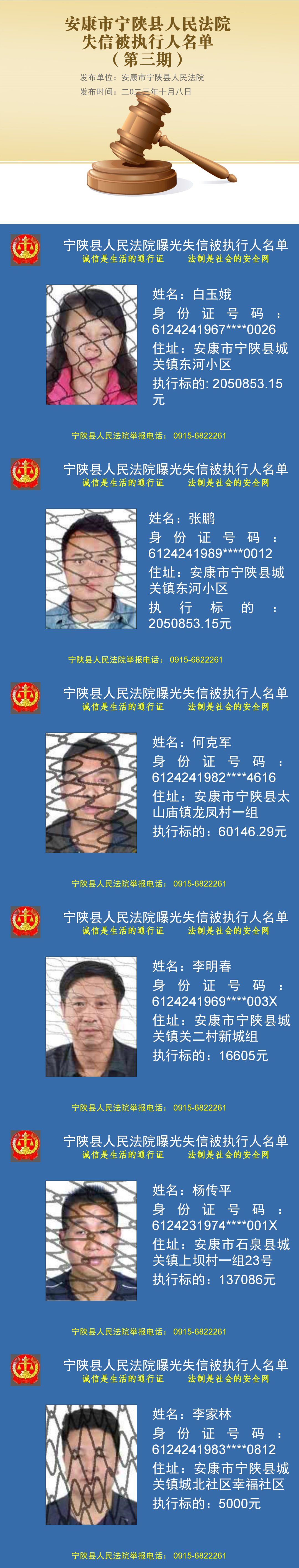 為維護(hù)司法權(quán)威,推動(dòng)社會(huì)誠(chéng)信體系建設(shè),促使被執(zhí)行人履行生效法律文書(shū)確定的義務(wù),根據(jù)《中華人民共和國(guó)民事訴訟法》第二百五十五條和《最高人民法院關(guān)于公布失信被執(zhí)行人名單信息的若干規(guī)定》的規(guī)定,被執(zhí)行人具有履行能力而不履行生效法律文書(shū)確定的義務(wù),人民法院應(yīng)當(dāng)將其納入失信被執(zhí)行人名單,依法對(duì)其進(jìn)行信用懲戒?,F(xiàn)將安康市寧陜縣人民法院2023年第三期失信被執(zhí)行人名單予以公布。