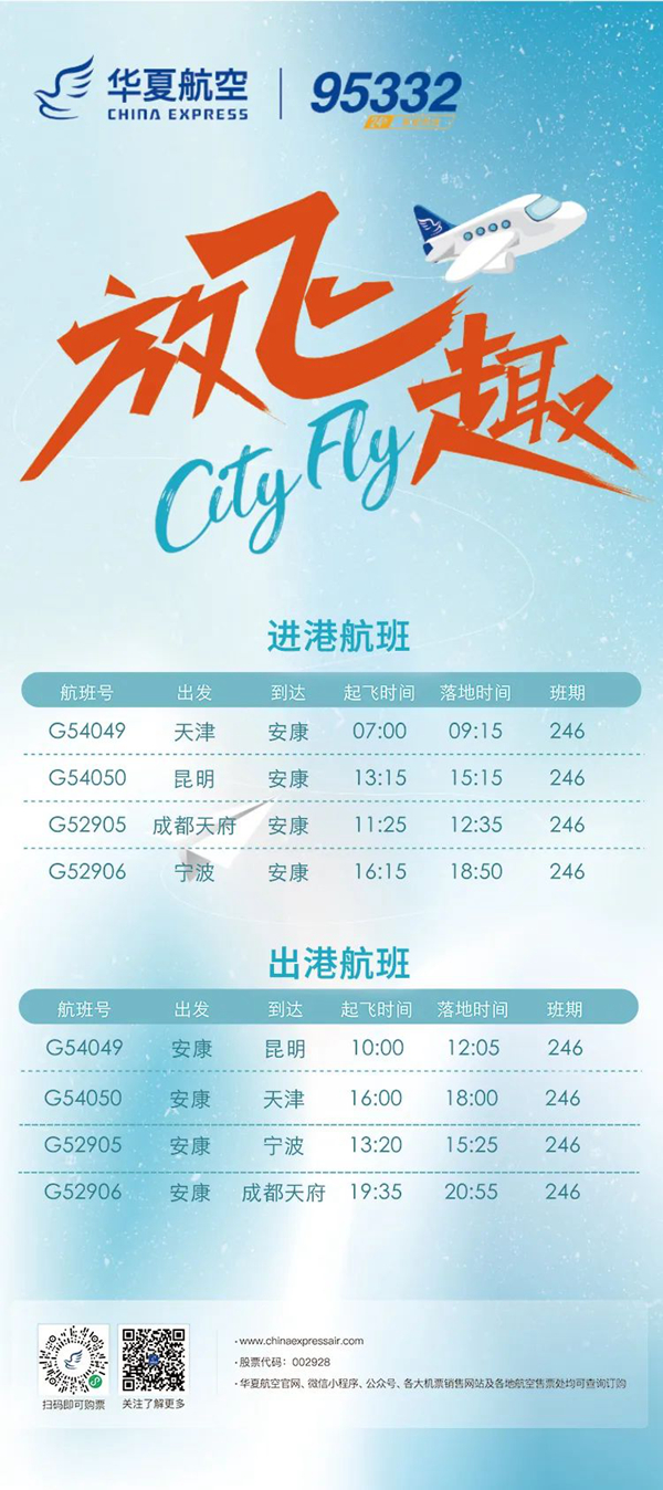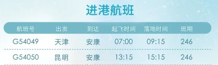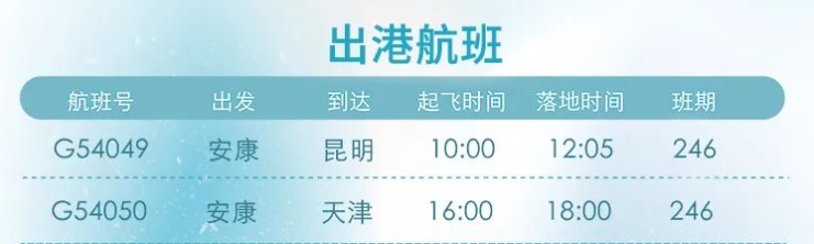 12月26日起,安康富強(qiáng)機(jī)場新增“安康=昆明”“安康=天津”航線。具體航線航班如圖: