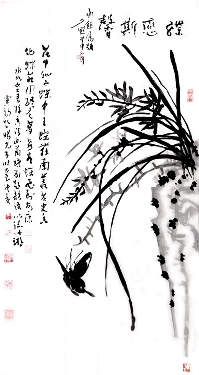 1988年,中國畫壇號稱“蝶王”的王冰如女士,以80歲高齡回到她曾工作生活10年之久的第二故鄉(xiāng)安康舉辦畫展,并且以詩書畫會友,特邀旸光先生和金州著名詩人劉寅初老人同游香溪,冰如老師興之所至,巧繪墨蝶,說道“人言寅初老弟有曹子健七步成詩之才,今日以十步為限,將此畫為題,賦詩一首,旸光老弟書于其上如何?”寅初老只走了三步便道有了,于是順口吟誦,旸光先生揮毫急就“花中仙子蝶中王,蝶舞籣叢花更香,化蝶莊周終是夢,喜看蝶王飛安康。”一筆流暢的行草躍然于畫上,相輔相成,真是詩情畫意天作之合。一幅難遇難得難覓的“三絕圖”誕生了。冰如老師感慨萬千,說到“二位弟臺才高八斗,只可惜待在安康這個貧瘠的地方被埋沒了也!”這個場面是一種巧合,正是旸光先生“萬事隨緣”的結(jié)晶,爾后經(jīng)書壇大家陳少默先生為之題跋做款,更是錦上添花,成了四絕圖。冰如、少默、旸光、寅初先生已然作古,這段翰墨丹青之情,將永存世間傳為藝術(shù)佳話。