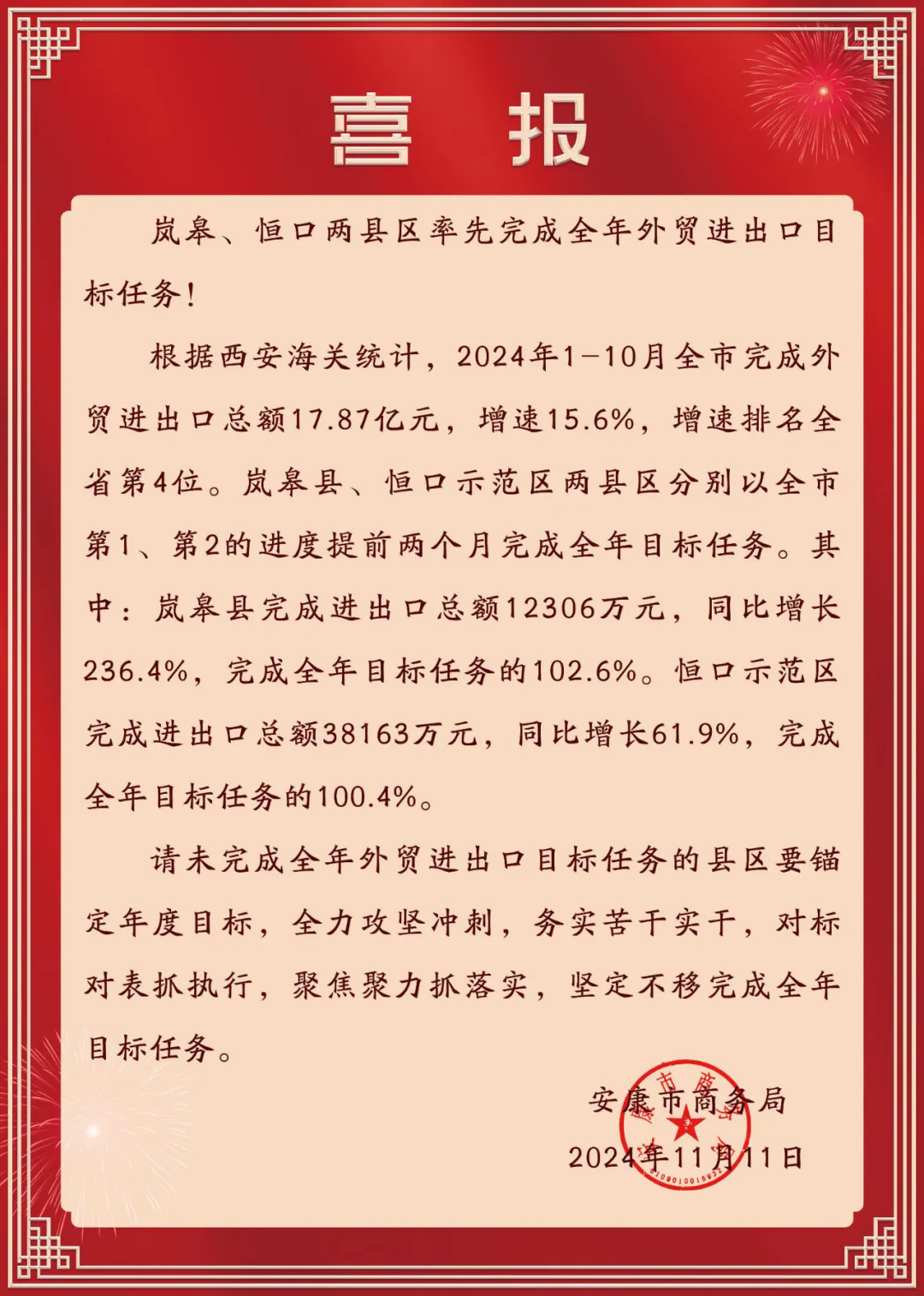 ?近日,市商務局發(fā)來喜報,恒口示范區(qū)率先完成全年外貿(mào)進出口目標任務。
