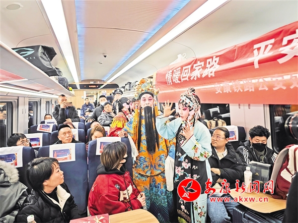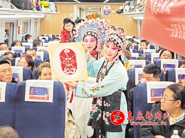 火車穿越秦巴山水間,途中,來自安康漢調(diào)二黃研究院的專業(yè)演員和地方民間漢調(diào)二黃愛好者們一同表演了國家級非物質(zhì)文化遺產(chǎn)——漢調(diào)二黃經(jīng)典戲曲演唱,并為旅客們講解漢調(diào)二黃戲曲知識,與旅客們開展互動交流,讓旅客親身體驗漢調(diào)二黃戲服道具,感受漢調(diào)二黃的獨特藝術魅力。來自漢濱區(qū)文化館的漢濱剪紙技藝傳承人為旅客們展示講解了安康市級非物質(zhì)文化遺產(chǎn)——漢濱剪紙技藝,向參與互動的旅客送上了親手創(chuàng)作的漢濱剪紙作品,提前送上新春祝福?;顒又?,西安鐵路公安局安康公安處的民警們和文藝工作者們一同宣傳普及了反詐知識,進一步提升旅客的安全防范意識。