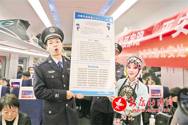 1月14日,由西安開往達州的D173次列車上,西安鐵路公安局安康公安處聯(lián)合漢濱區(qū)文化館、安康漢調(diào)二黃研究院的文藝工作者,以地方非物質(zhì)文化遺產(chǎn)技藝展示等方式,結(jié)合春運開展反詐知識宣講,讓旅客們在春運旅途中感受安康地方傳統(tǒng)文化獨特魅力,提升安全意識。