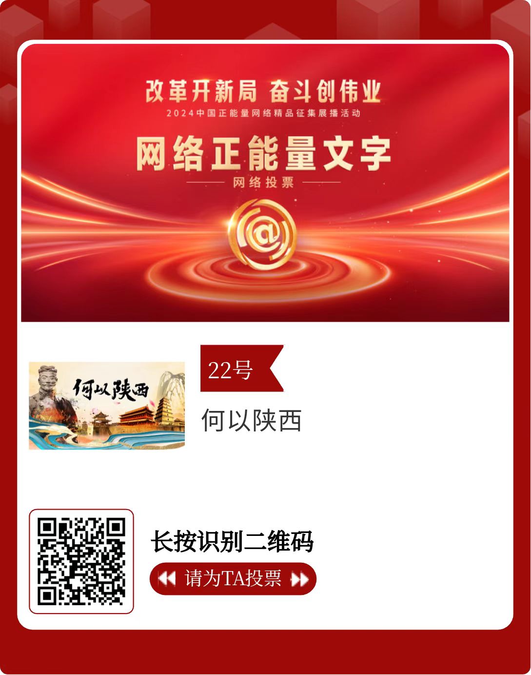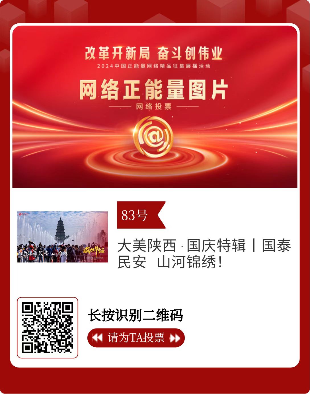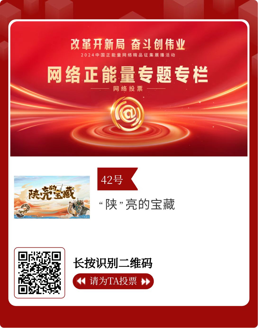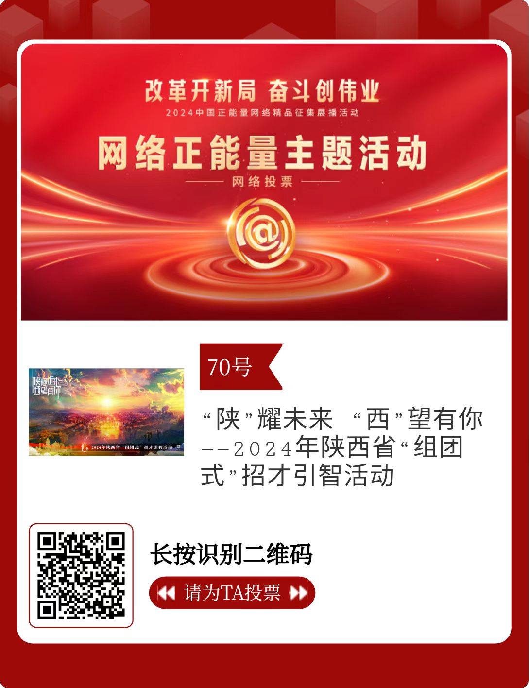 陜西省32件作品進入投票環(huán)節(jié),投票時間為2月15日至2月21日,投票結(jié)果將作為中國正能量網(wǎng)絡精品遴選的重要參考。中國正能量網(wǎng)絡精品,期待每一個充滿正能量的你投出點贊一票。