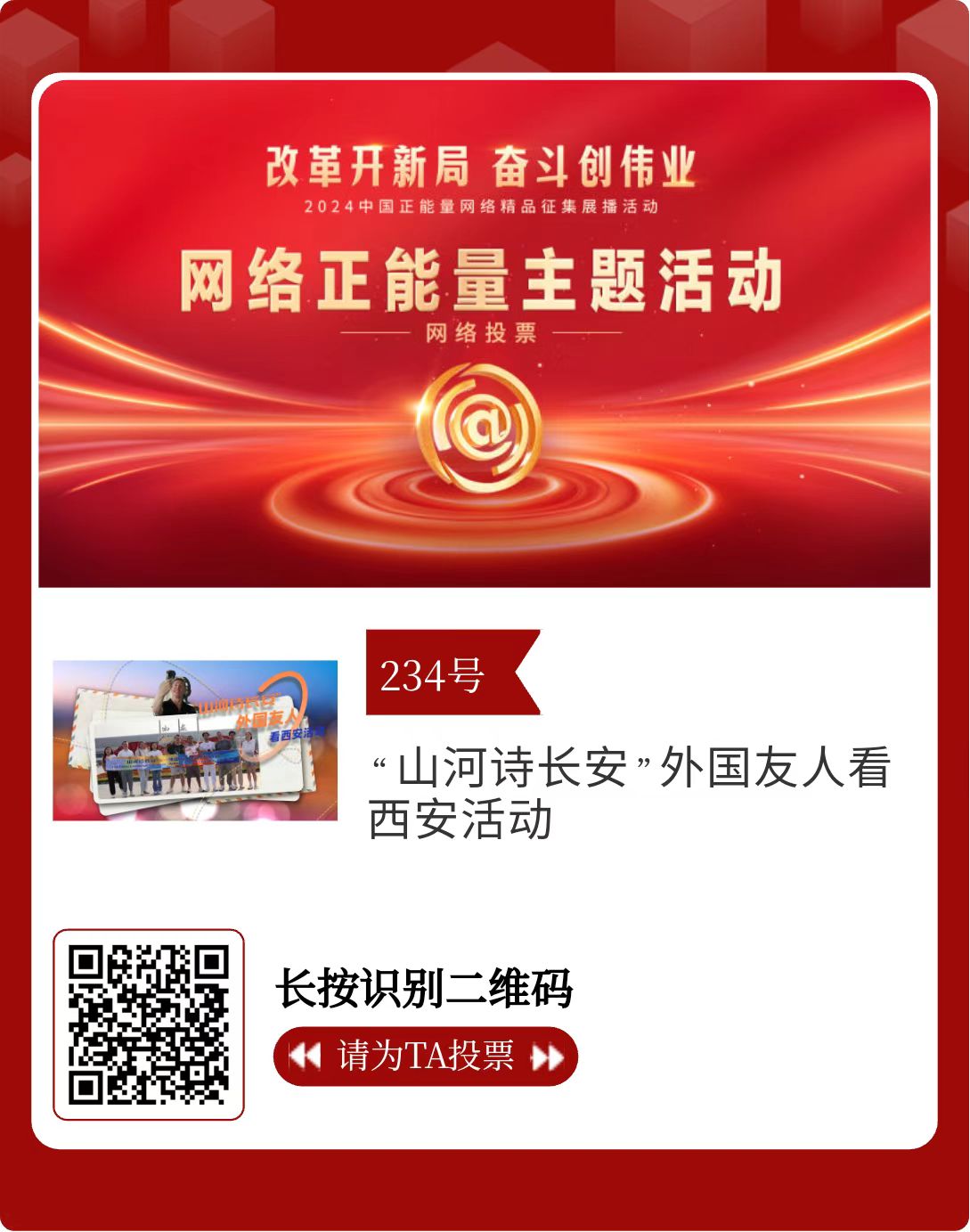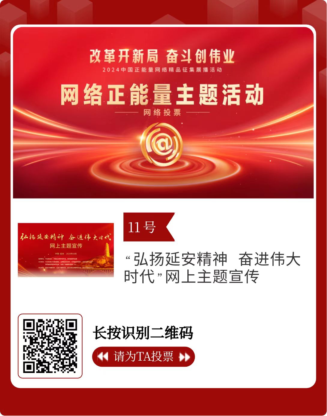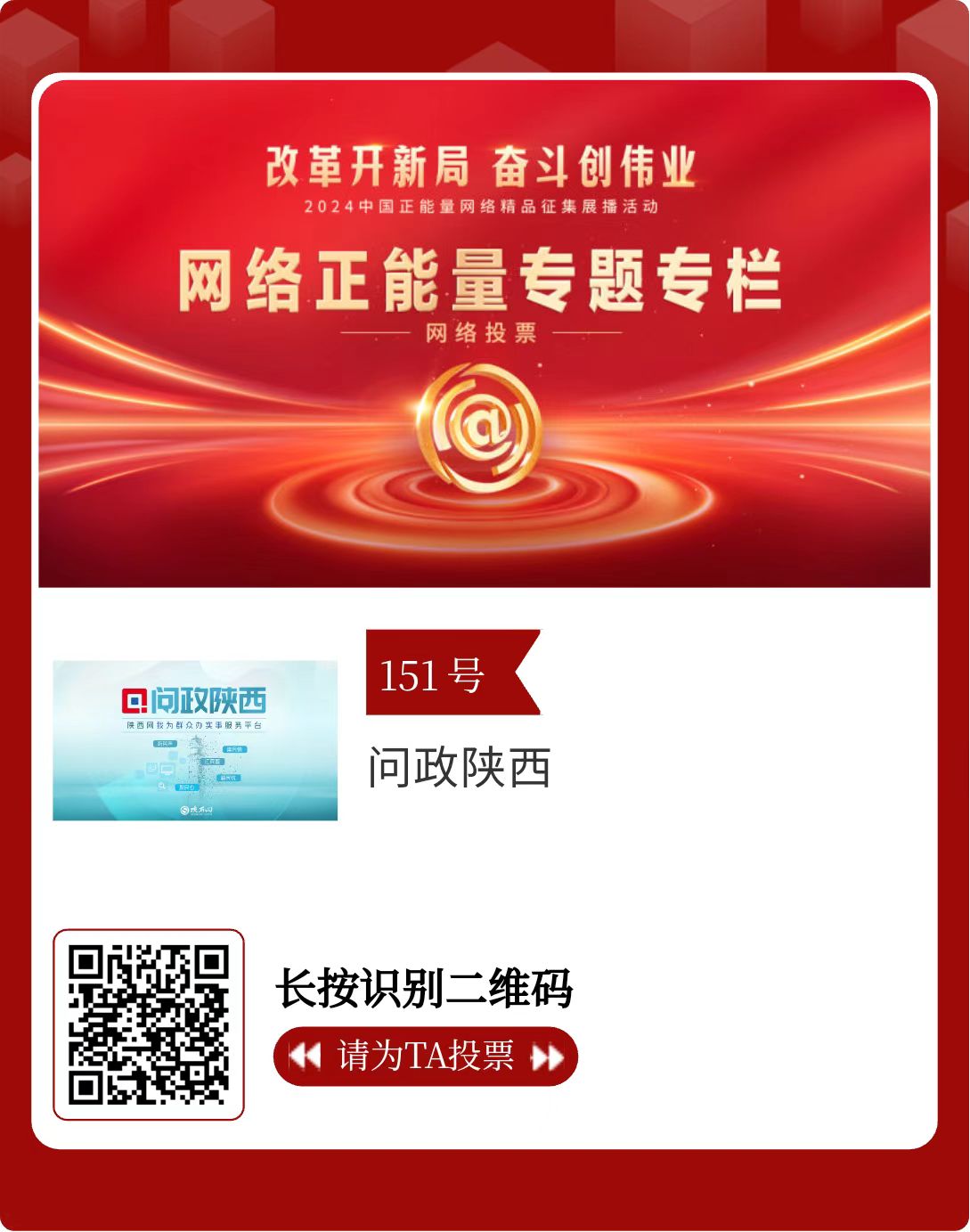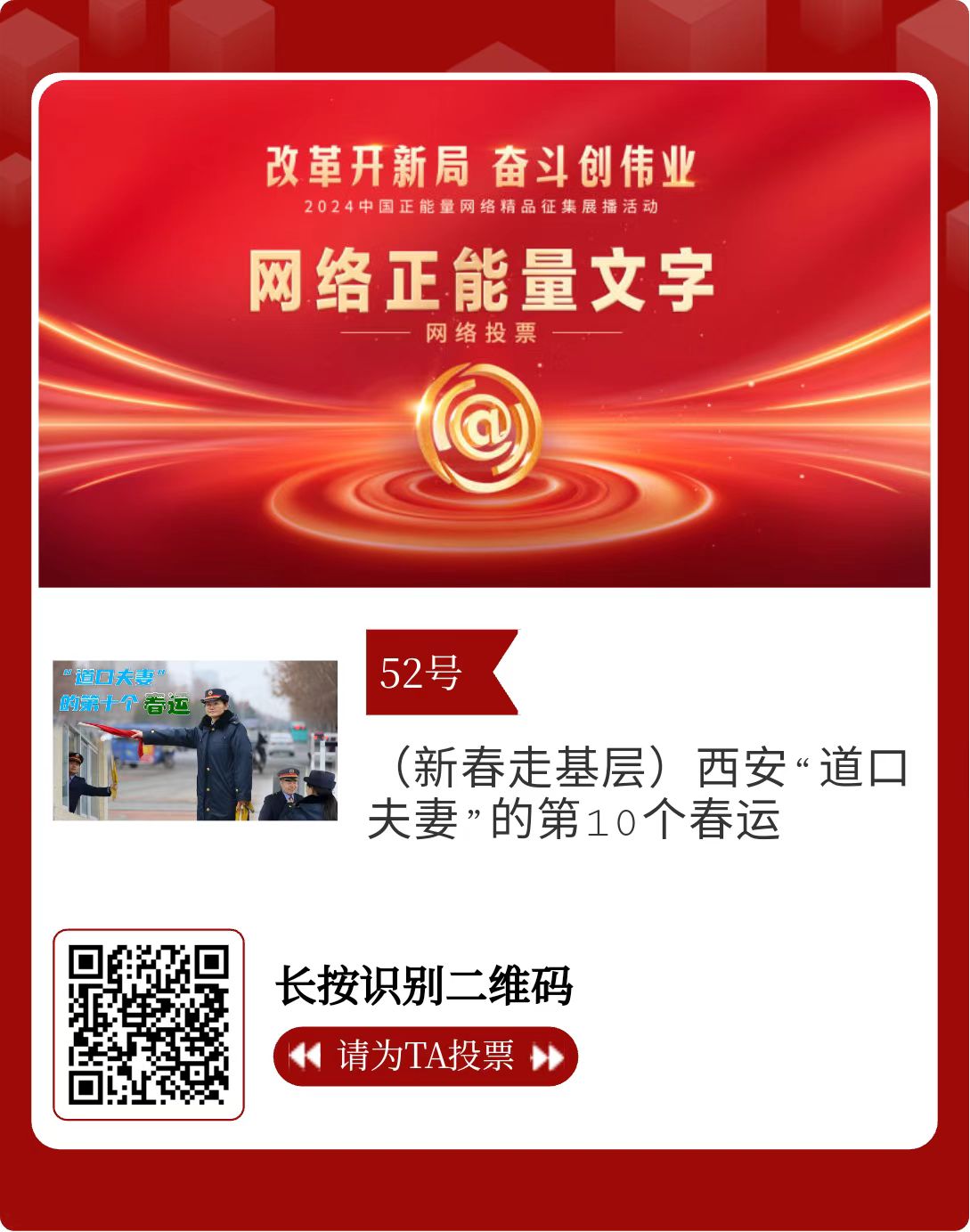 陜西省32件作品進入投票環(huán)節(jié),投票時間為2月15日至2月21日,投票結(jié)果將作為中國正能量網(wǎng)絡精品遴選的重要參考。中國正能量網(wǎng)絡精品,期待每一個充滿正能量的你投出點贊一票。