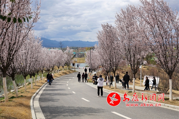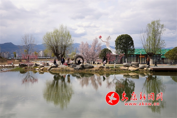 景區(qū)紫葉李、桃花競(jìng)相綻放,吸引市民前往觀賞。