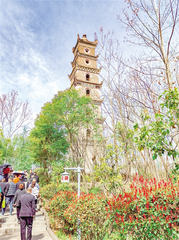 這時,塔側傳來歡快的鑼鼓聲,循聲望去,是一段十幾米的孝義文化長廊,一組男女或站或坐敲打著響器,使奠安塔不再寂寞。廊道的另一頭連接著奠安公園,環(huán)形觀景步道上擠滿了游覽的人。春分時節(jié),杏花正在萌發(fā),桃花含苞待放,倒是紅葉李花開正艷,細小如甲的花瓣布滿枝頭,零落軟泥上,雪白一片,仿佛成了李花的世界。舉目四望,花草清新,小學生在撿拾垃圾,胸前的紅領巾在陽光的照射下熠熠生輝,與周遭綠植映襯,絢爛了滿園春色。