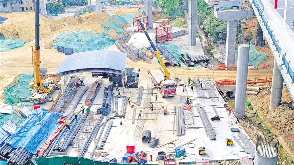 4月9日,七里溝立交橋項(xiàng)目建設(shè)現(xiàn)場(chǎng)一角,施工者正在綁扎鋼筋。 周亭松 攝