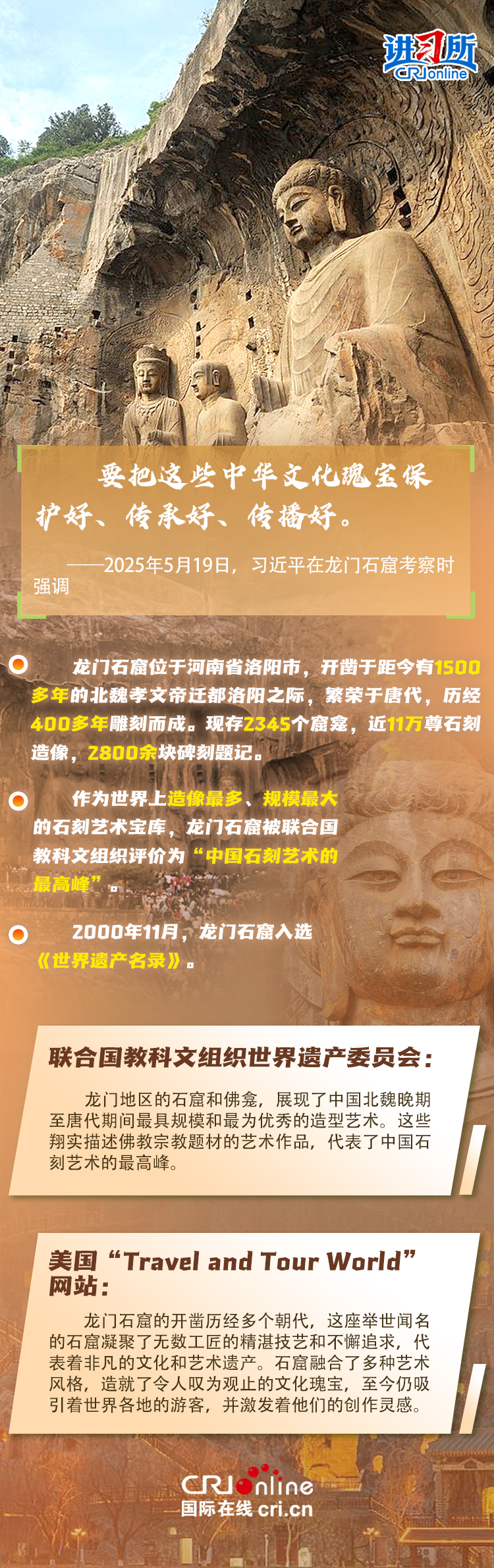 龍門石窟被聯(lián)合國(guó)教科文組織評(píng)價(jià)為“中國(guó)石刻藝術(shù)的最高峰”,與敦煌莫高窟、云岡石窟、麥積山石窟并稱為“中國(guó)四大石窟”,具有重要?dú)v史價(jià)值、文化價(jià)值。近年來,習(xí)近平先后考察了中國(guó)四大石窟。對(duì)這些承載著中華民族文化基因和血脈的文物和文化遺產(chǎn),習(xí)近平強(qiáng)調(diào),“保護(hù)好、傳承好歷史文化遺產(chǎn)是對(duì)歷史負(fù)責(zé)、對(duì)人民負(fù)責(zé)?!?/p>