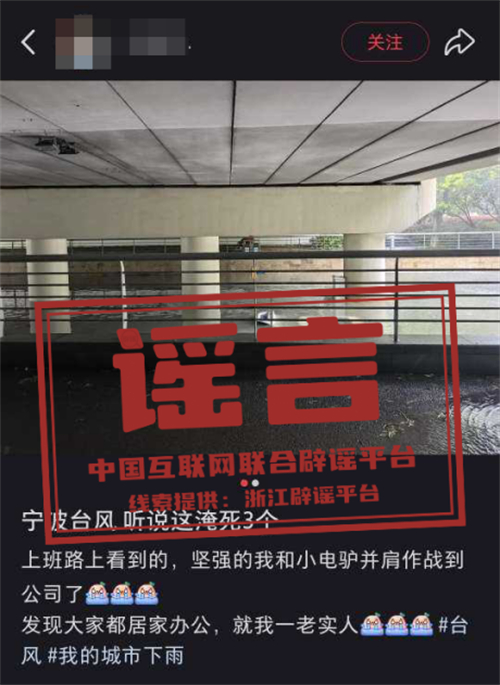 真相:7月30日10時(shí)許,某短視頻平臺(tái)網(wǎng)民湯某(女,63歲,寧波鄞州人)發(fā)布一段汽車(chē)被水沖走的視頻,并標(biāo)注“寧波海曙區(qū)龍觀(guān)大路村,臺(tái)風(fēng)造成情況”。經(jīng)核查,海曙龍觀(guān)大路村并未出現(xiàn)視頻中情況。目前公安機(jī)關(guān)已對(duì)湯某依法予以批評(píng)教育,該視頻現(xiàn)已刪除。(來(lái)源:“上海網(wǎng)絡(luò)辟謠”微信公眾號(hào)、“寧波發(fā)布”微信公眾號(hào))
