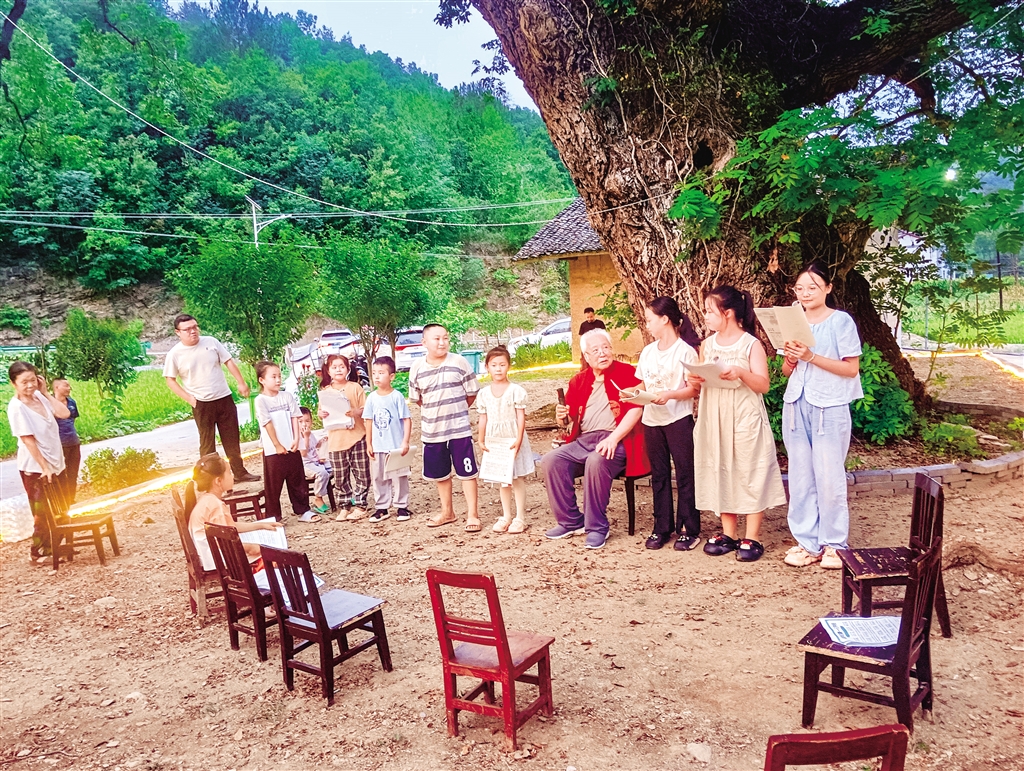 韓海燕(右四)在西河鎮(zhèn)磨溝村的古樹(shù)下給孩子們傳授國(guó)學(xué)知識(shí)