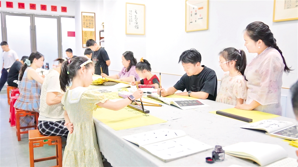 “我們來看下這‘?!郑亲笥医Y(jié)構(gòu)的字,左邊的偏旁是一個(gè)三點(diǎn)水,三點(diǎn)水寫的時(shí)候要注意連貫性……”書法老師細(xì)致地拆解著漢字的書寫技巧,耐心指導(dǎo)著現(xiàn)場(chǎng)的每一位學(xué)員。