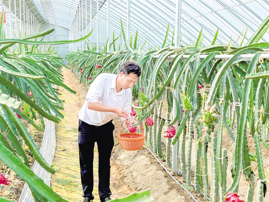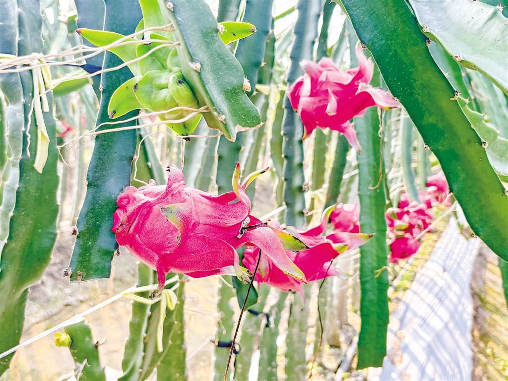 “火龍果作為典型熱帶、亞熱帶作物,對溫度、光照條件要求比較嚴苛。去年,我從臺灣引進了蜜玄龍紅心火龍果,經(jīng)過反復栽培試驗,科學種植,克服了我們當?shù)氐臍夂?、土壤等自然條件限制,而且全部是無公害綠色種植,無任何添加劑,綠色健康……”負責人姜明悅為大家細細地介紹道。