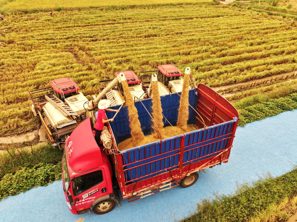 近日,四川省達州市渠縣有慶鎮(zhèn)太陽村農(nóng)民轉(zhuǎn)運剛收獲的水稻(無人機照片)。白露節(jié)氣之際,各地農(nóng)民搶抓農(nóng)時,田間地頭一片農(nóng)忙景象。新華社發(fā)(鄧良奎 攝)