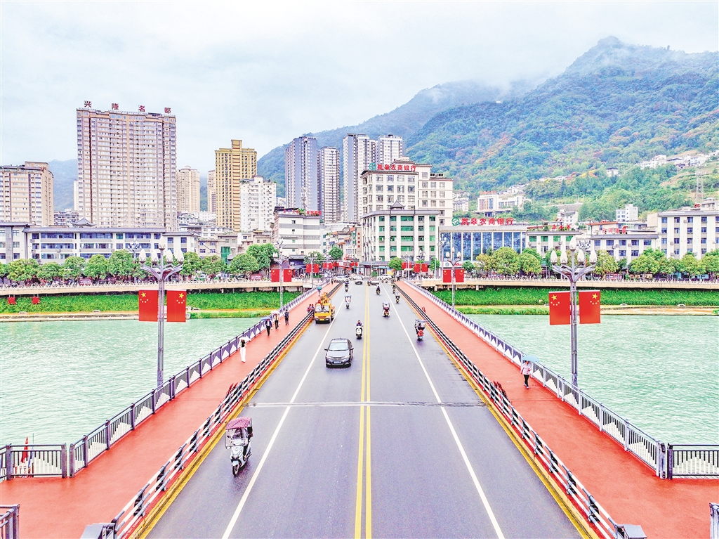 在嵐皋縣大橋兩側(cè),一面面整齊的五星紅旗迎風(fēng)飄揚(yáng),喜迎國(guó)慶。?