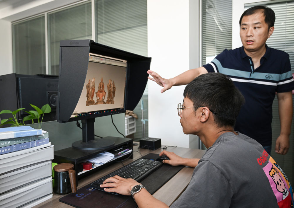 ??2023年8月3日,敦煌研究院文物數(shù)字化研究所的工作人員在展示莫高窟彩塑三維重建的成果。近年來(lái),敦煌研究院持續(xù)加大文物保護(hù)基礎(chǔ)研究和應(yīng)用研究,不斷加強(qiáng)文物科技保護(hù)力度,提升科研平臺(tái)建設(shè),為文物保護(hù)和文化遺產(chǎn)事業(yè)發(fā)展奠定良好基礎(chǔ)。