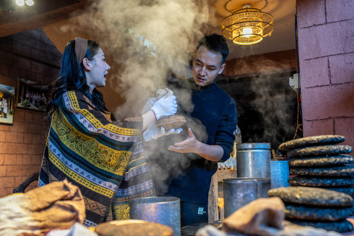 2024年4月13日,一名俄羅斯塔斯社記者(右)在大理市體驗(yàn)包裝下關(guān)沱茶。據(jù)統(tǒng)計(jì),2025年1月至6月,云南省接待入境過夜游客251.03萬人次,同比增長86%。