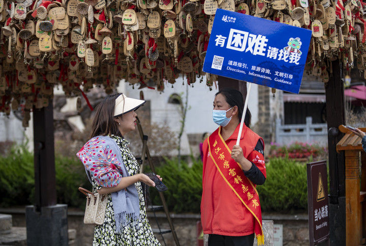 2023年5月18日,一名游客(左)在麗江古城向志愿者咨詢。2015年12月,云南麗江古城保護(hù)管理局牽頭成立了麗江古城旅游志愿者服務(wù)隊(duì),志愿者主要來自市區(qū)機(jī)關(guān)單位、古城保護(hù)管理局、古城經(jīng)營戶、在校學(xué)生、社區(qū)居民等,常年在古城內(nèi)提供旅游咨詢、道路指引、文明引導(dǎo)等志愿服務(wù)。