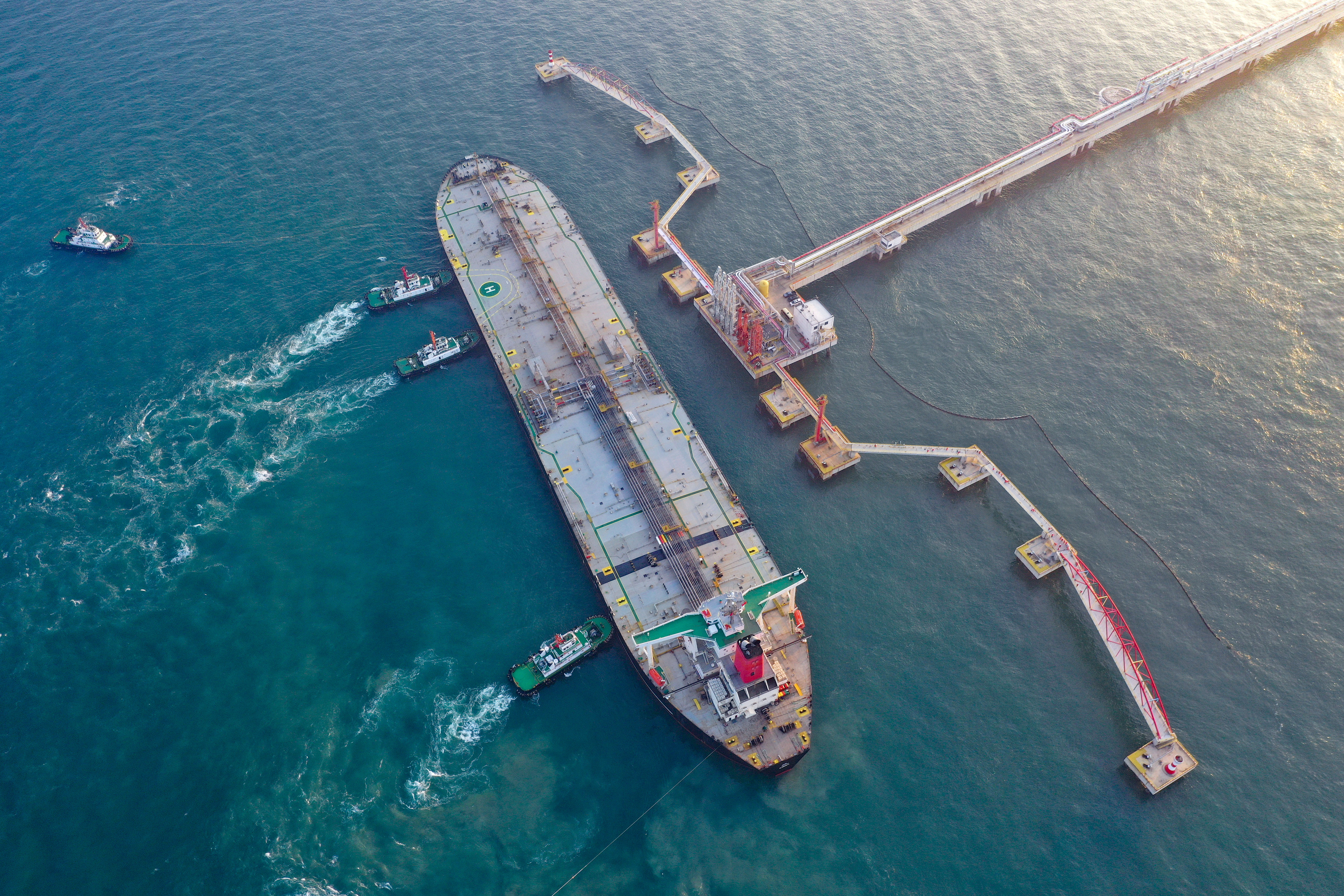 △ 2025年12月18日,一艘裝載著17.9萬噸石化原輔料的船舶泊入位于海南省儋州市的國投洋浦油儲(chǔ)碼頭30萬噸級(jí)原油泊位(無人機(jī)照片)。