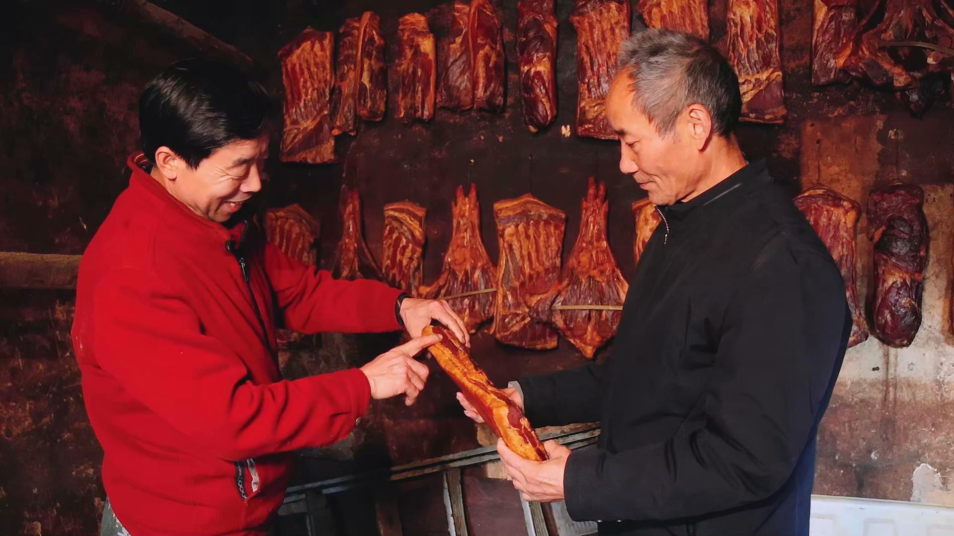 石泉縣城關鎮(zhèn)珍珠河村村民王全勇(左)熏制臘肉已有十來年,是當地有名的臘味制作能手。今年,他熏制的上萬斤臘肉和香腸早早就被預訂,有的還通過網絡被賣到北京、山東等省市。 郭依萍 攝