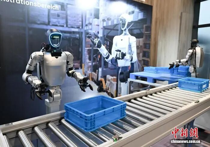 資料圖:宇樹科技人形機器人模擬流水線生產(chǎn)場景。中新社記者 王剛 攝