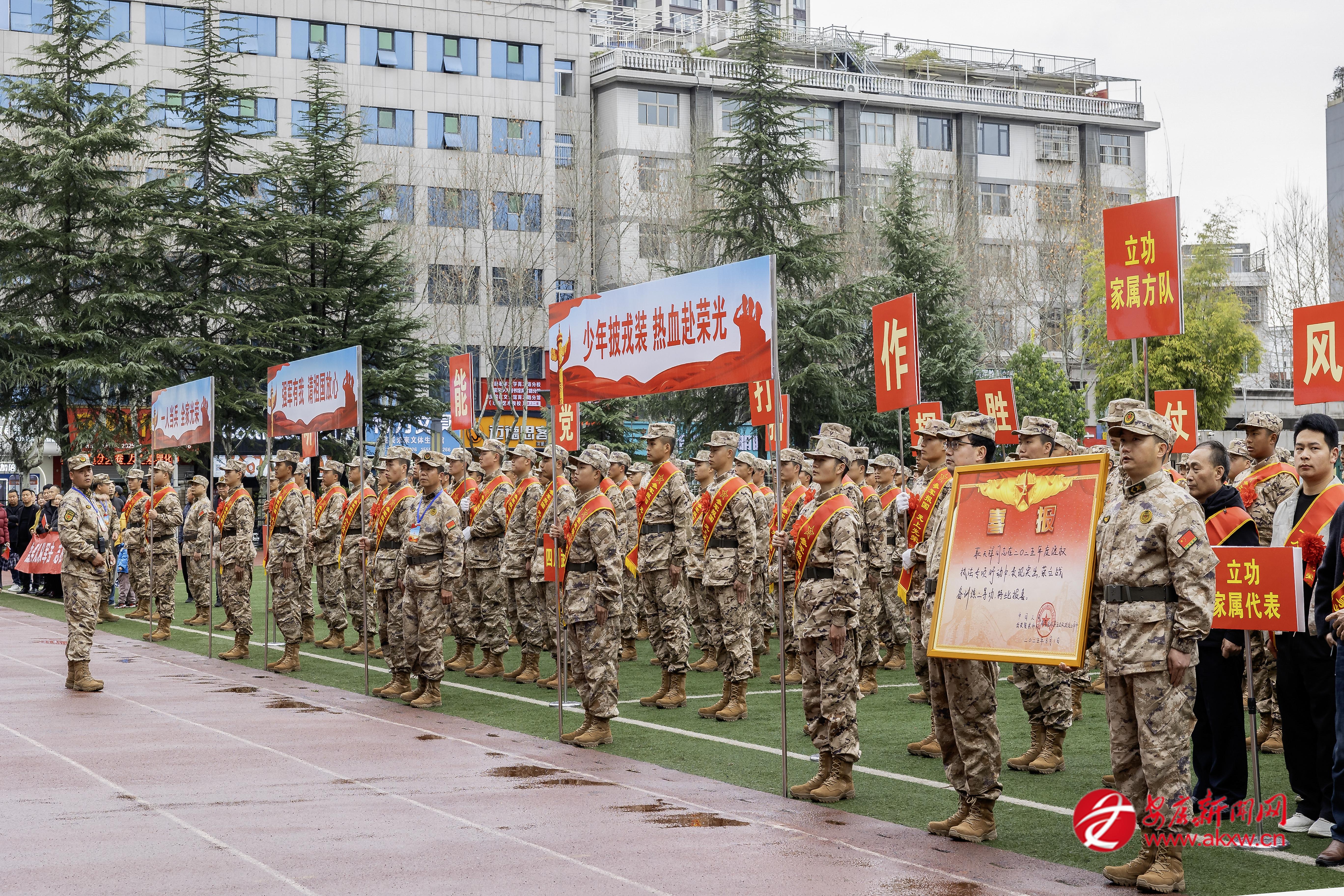 3月15日,漢濱區(qū)舉行集中慶送立功喜報暨2026年上半年歡送新兵儀式。胸戴紅花、身披綬帶的新兵們精神抖擻、英姿勃發(fā)。李成菊 攝