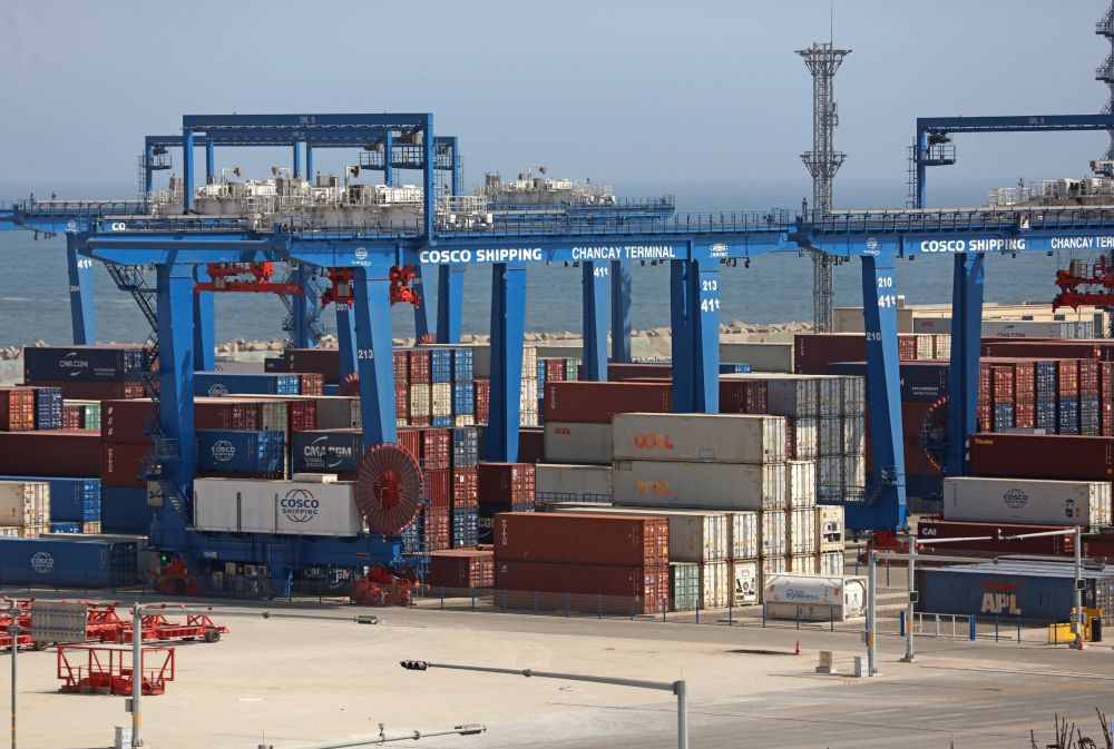 這是2025年10月7日拍攝的秘魯錢凱港碼頭擺放的集裝箱。位于秘魯首都利馬以北約80公里的錢凱港于2024年11月正式開港,標志著中秘共建“一帶一路”取得新的重要成果。新華社發(fā)(瑪麗安娜·巴索 攝)