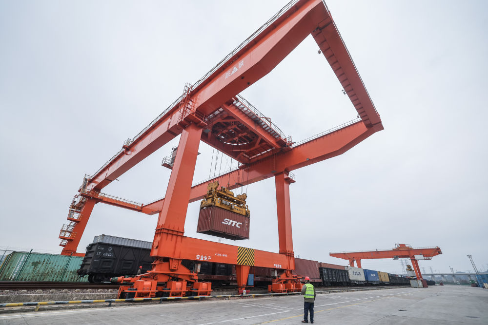 2026年1月30日,在浙江義烏鐵路口岸,一列載著紅酒、葵花籽油、氣泡水等進口商品的中歐班列回程班列在卸貨。新華社記者 徐昱 攝