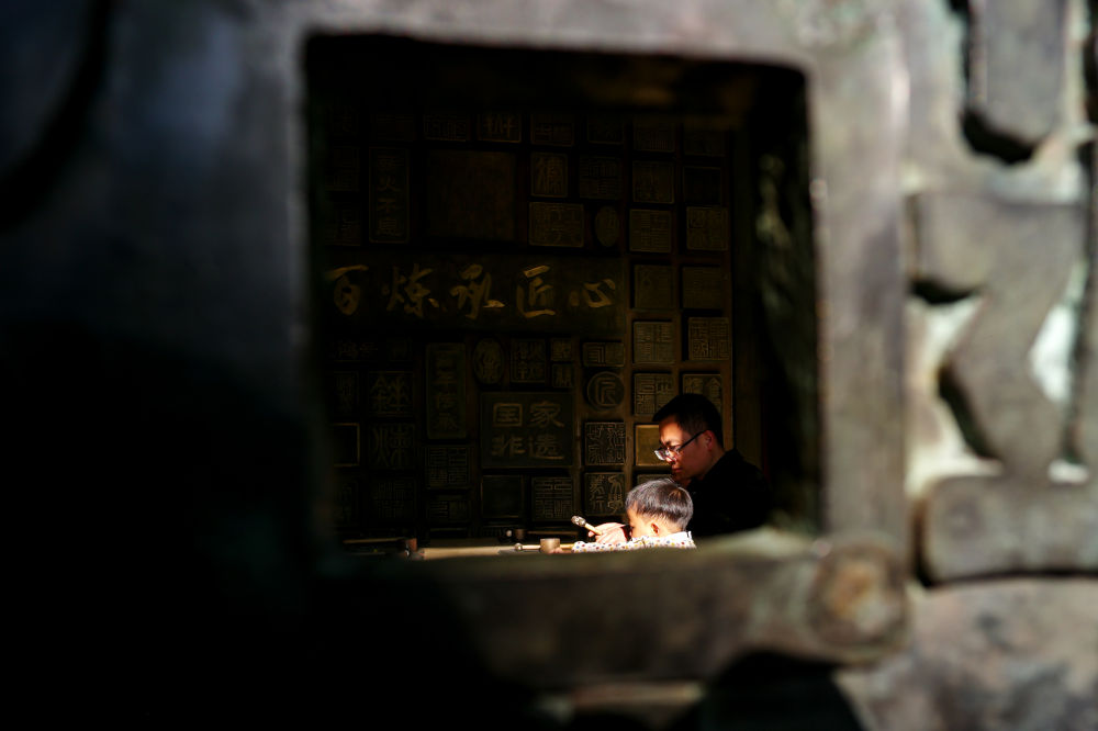 2026年3月25日,在云南曲靖會(huì)澤縣國(guó)家級(jí)非遺斑銅制作技藝傳習(xí)館,張氏斑銅第十三代傳人張偉在教兒子敲打銅器。會(huì)澤以“保護(hù)優(yōu)先、匠心修復(fù)、多元活化、融合共生”為路徑推進(jìn)古城活化保護(hù),對(duì)會(huì)館、民居等古建筑匠心修繕、活化利用,同時(shí)保留居民生活業(yè)態(tài),常態(tài)開(kāi)展特色文化活動(dòng),用微改造提升古城環(huán)境。