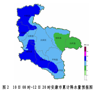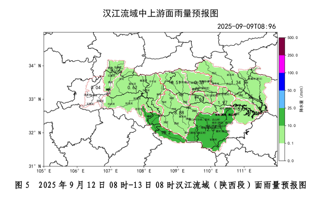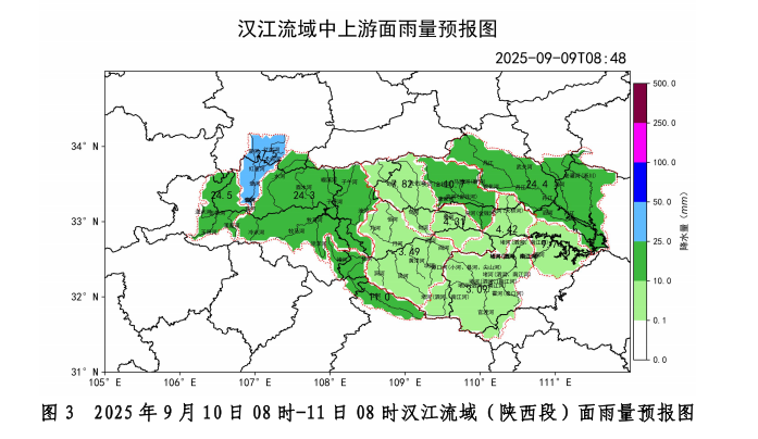 預(yù)計10日08時-11日08時漢江流域(陜西段)大部面雨量0.1~10毫米,玉帶河、酉水河、子午河、任河流域面雨量10-25毫米,褒河流域面雨量25-50毫米(圖3);11日08時-12日08時漢江流域(陜西段)褒河、酉水河、子午河、任河面雨量25~50毫米,其余中小河流流域面雨量10~25毫米(圖4);12日08時-13日08時漢江流域(陜西段)任河、堵河流域面雨量達10~25毫米,其余中小河流流域面雨量0.1~10毫米(圖5)。