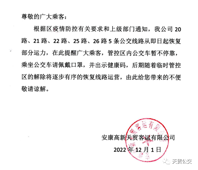 按照市道路運(yùn)輸服務(wù)中心印發(fā)的《中心城市有序恢復(fù)公交、出租客運(yùn)行業(yè)運(yùn)輸服務(wù)工作的實(shí)施方案》要求,為更好滿足復(fù)工復(fù)產(chǎn)和市民出行需求,自12月1日12:00起,我公司1路、3路、4路、5路、9路、12路、13路、16路8條公交線路恢復(fù)營運(yùn),車輛趟次隨運(yùn)營需求逐步增加,其他線路逐步有序恢復(fù)。