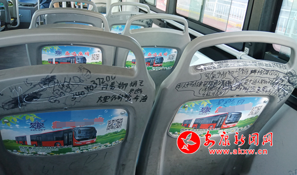 7月7日,筆者乘坐安康市城區(qū)7路公交車發(fā)現(xiàn),公交座椅靠背慘遭“涂鴉”,內(nèi)容不乏廣告標語、低俗粗鄙、不堪入目的語言,嚴重影響乘車心情。希望廣大乘客文明乘車,還市民一個干凈整潔的乘車環(huán)境。(通訊員 成忠旭)siz安康新聞網(wǎng)