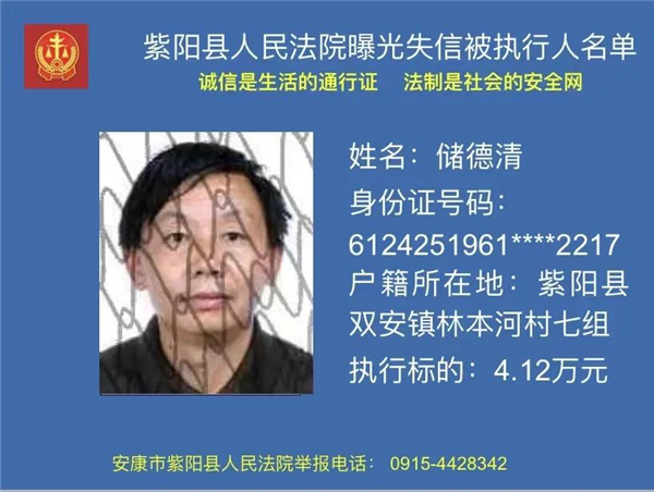 被執(zhí)行人儲(chǔ)德清,你因不履行(2017)陜0924民初241號(hào)民事判決書確定的義務(wù),已被紫陽(yáng)縣人民法院納入失信被執(zhí)行人名單庫(kù)依法進(jìn)行信用懲戒。信用懲戒范圍包括但不限于以下措施:
