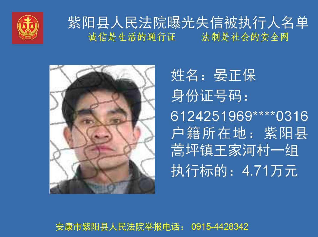 被執(zhí)行人晏正保,你因不履行(2017)陜0924民初241號(hào)民事判決書確定的義務(wù),已被紫陽縣人民法院納入失信被執(zhí)行人名單庫(kù)依法進(jìn)行信用懲戒。信用懲戒范圍包括但不限于以下措施: