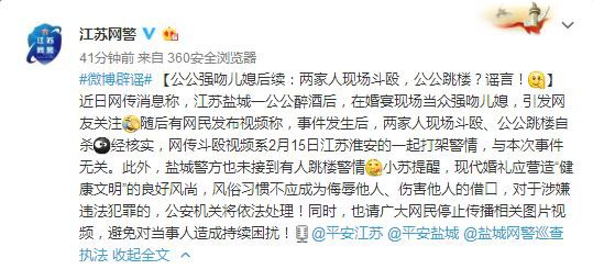 2月26日9時(shí)3 3分,江蘇省公安廳網(wǎng)絡(luò)安全保衛(wèi)總隊(duì)官方微博“江蘇網(wǎng)警”對(duì)此辟謠,“經(jīng)核實(shí),網(wǎng)傳斗毆視頻系2月15日江蘇淮安的一起打架警情,與本次事件無(wú)關(guān)。此外,鹽城警方也未接到有人跳樓警情。”