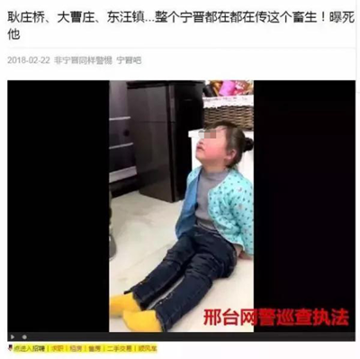 隨后,“父親打女兒”的視頻配上了“某地都在傳這個(gè)畜生!曝死他”等標(biāo)題在各地的微信群、自媒體平臺(tái)瘋狂傳播,并配文稱視頻內(nèi)的父親是當(dāng)?shù)厝耍粲醍?dāng)?shù)厝罕娨黄饘ふ疫@位虐童父親。