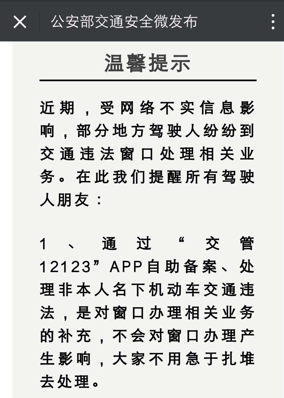 2月26日,公安部交通管理局通過(guò)官方微信發(fā)布文章,對(duì)新增項(xiàng)目推出后群眾提出的問(wèn)題進(jìn)行答疑,并提醒駕駛?cè)伺笥逊Q“通過(guò)‘交管12123’APP自助備案、處理非本人名下機(jī)動(dòng)車交通違法,是對(duì)窗口辦理相關(guān)業(yè)務(wù)的補(bǔ)充,不會(huì)對(duì)窗口辦理產(chǎn)生影響,大家不用急于扎堆去處理。”同日,北京交警也通過(guò)官方微信辟謠稱“3月1日起,不綁定備案就不能處理非本人名下車輛違法”系誤讀,并提示:在北京市,不通過(guò)網(wǎng)上渠道處理非本人名下機(jī)動(dòng)車交通違法的車主,依然可以通過(guò)各交通支、大隊(duì)執(zhí)法站窗口辦理。