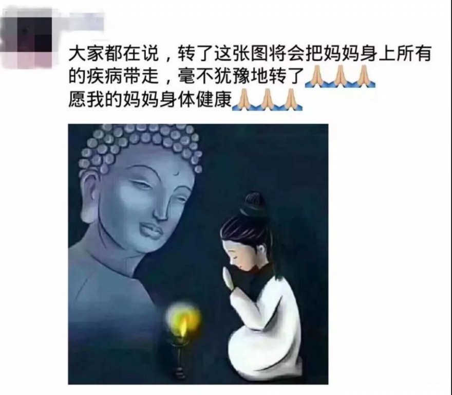 “愿母親幸福安康”、“據(jù)說(shuō)這張圖會(huì)把爸媽身上的疾病帶走”……燭光下,白衣束發(fā)人士單手合十,對(duì)著慈眉善目的“菩薩”虔誠(chéng)跪拜,春節(jié)假期,這幅“地藏菩薩圖”在朋友圈熱傳,不少網(wǎng)友轉(zhuǎn)發(fā)并配上祝福家人的文字。
