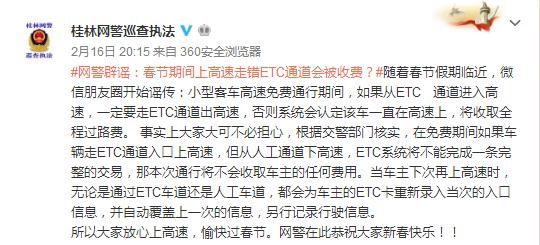 春節(jié)假期,微信朋友圈謠傳:小型客車高速免費(fèi)通行期間,如果從ETC通道進(jìn)入高速,一定要走ETC通道出高速,否則系統(tǒng)會(huì)認(rèn)定該車一直在高速上,將收取全程過(guò)路費(fèi)。