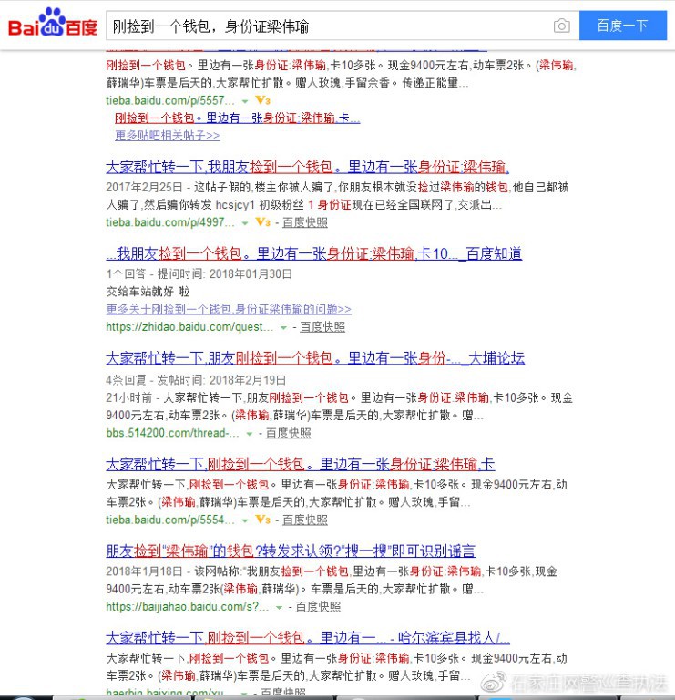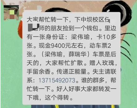 一條“失物招領(lǐng)”的信息在全國(guó)多地的微信群和朋友圈中熱傳,該信息稱:“我朋友撿到一個(gè)錢包,里邊有一張身份證:梁偉瑜,卡10多張,現(xiàn)金9400元左右,動(dòng)車票2張(梁偉瑜,薛瑞華)。車票是后天的,大家?guī)兔U(kuò)散。贈(zèng)人玫瑰,手留余香。傳遞正能量。失主請(qǐng)聯(lián)系:1362098XXXX。誰(shuí)的群多,幫忙轉(zhuǎn)一下……”