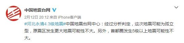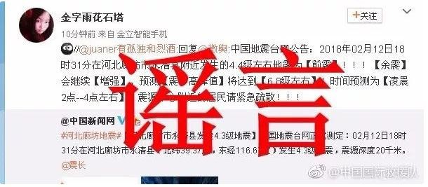 2月12日,河北永清地震發(fā)生不久后,網(wǎng)上有消息稱該縣“9958應(yīng)急救援隊(duì)接到通知,今晚11點(diǎn)30分有余震活動(dòng)!12日19時(shí)57分,河北省廊坊市人民政府新聞辦官微“廊坊發(fā)布”對(duì)此辟謠稱,“純屬謠言,公安部門正在追查謠言的源頭,請(qǐng)廣大群眾勿信勿傳謠言,以權(quán)威發(fā)布為準(zhǔn)!
