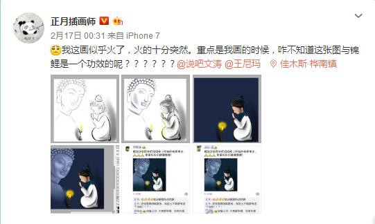 17日凌晨,該圖的原作者“正月插畫(huà)師”,微博認(rèn)證為“插畫(huà)師、美術(shù)教師”,發(fā)布消息稱“我這畫(huà)似乎火了,火的十分突然。重點(diǎn)是我畫(huà)的時(shí)候,咋不知道這張圖與錦鯉是一個(gè)功效的呢??????”