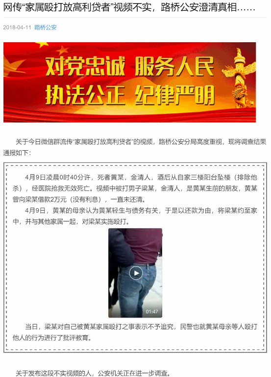 4月11日,據(jù)“路橋公安”官微發(fā)布辟謠消息稱,4月9日凌晨,浙江省臺州市路橋區(qū)金清鎮(zhèn)一黃某,酒后從自家三樓陽臺墜樓(排除他殺),經(jīng)醫(yī)院搶救無效死亡。視頻中被打男子為金清鎮(zhèn)梁某,是黃某生前的朋友,黃某曾向梁某借款2萬元(沒有利息),一直未還清。當(dāng)日,黃某的母親認(rèn)為黃某輕生與債務(wù)有關(guān),于是以還款為由,將梁某約至家中,并與其他家屬一起,對梁某實施毆打。事后,梁某對自己被黃某家屬毆打之事表示不予追究,民警也就黃某母親等人毆打他人的行為進(jìn)行了批評教育。
